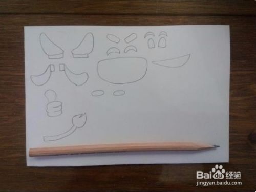 用铅笔在白卡纸上画出牛的分解图(头、嘴、耳朵、尾巴、鼻子等)。