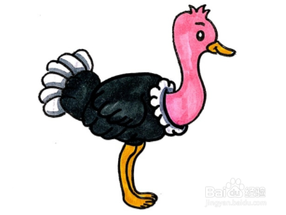 首先画出鸵鸟细长的脖子,画出它小小的头,接着画身体,画上羽毛的纹理,还有身后的尾巴,身下画上细长的腿,先给头部涂玫红色,身体涂黑色,双腿涂黄色,鸵鸟简笔画就完成啦!