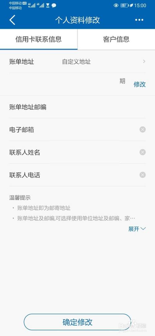 即可进入【个人资料修改】页面,可以看到信用卡【联系信息】如下图所示。