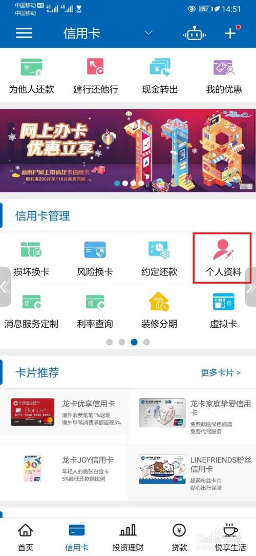 介绍通过建设手机银行查询建行信用卡个人资料等信息
