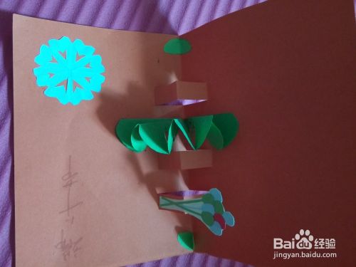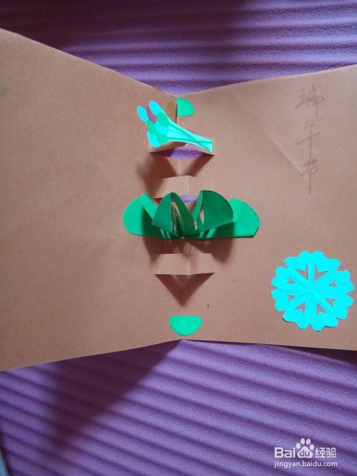 再剪一个八角花的的花纹右下角,将所有的材料部件贴在卡片上。如图所示