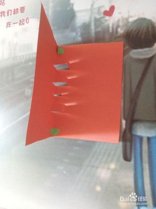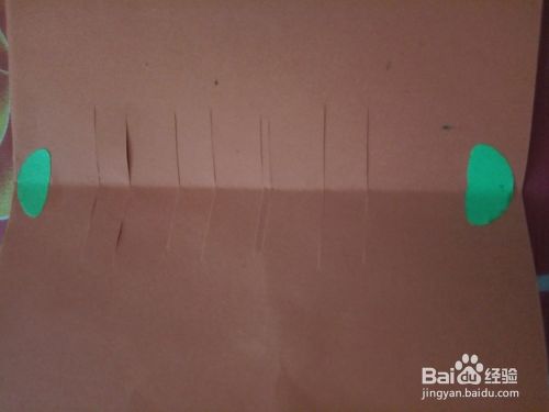 剪两个半圆形的卡纸贴在桔红色卡纸中间折痕两边。用剪刀在桔红色卡纸上剪直线,错折打开。如图所示