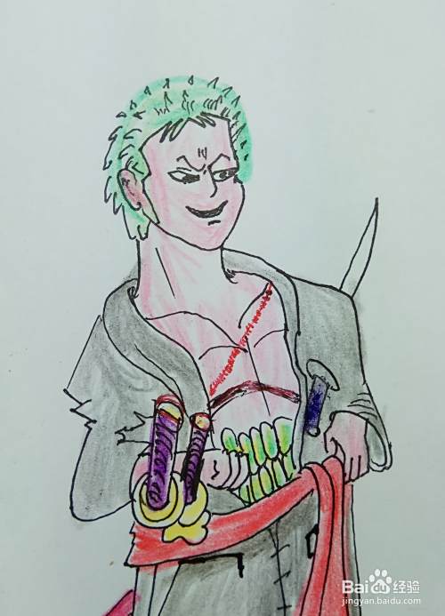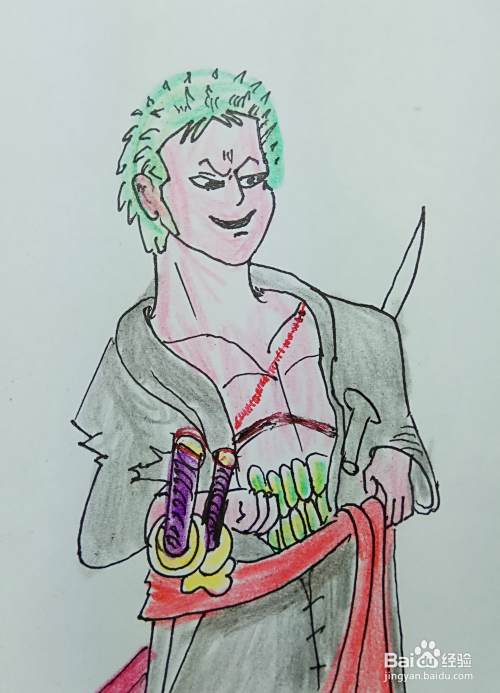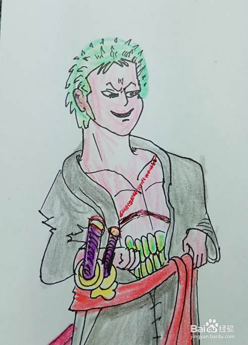 用水彩笔涂出他的头发色彩,然后再画出他肩膀上的佩带。