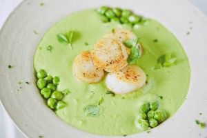 然后留少许豌豆用于装盘,剩下的豌豆沥干后倒入料理机中,加入80-100ml的温热的牛奶,以及5g黄油,打成豌豆泥。牛奶一次性不要加太多,以免豌豆泥过稀,建议先少加一点,如果太厚就再调整。