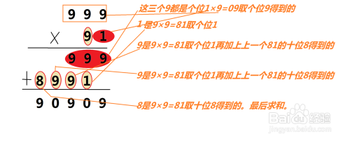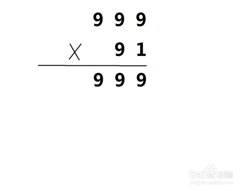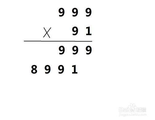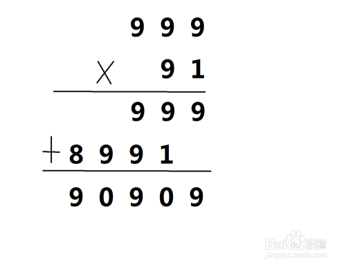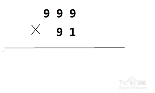 999为三位数,91为两位数所以999在上,当作被乘数,91在下,当成乘数。