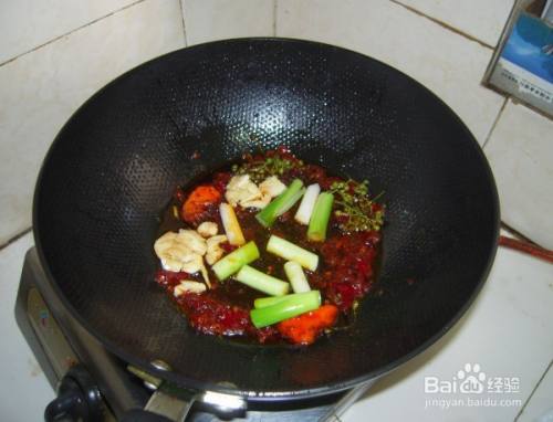 然后放入火锅底料炒香,然后放入大蒜和大葱段翻炒。