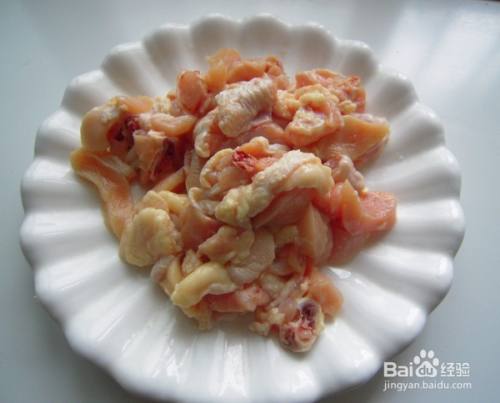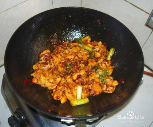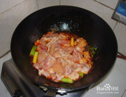 下入腌制好的鸡肉块,翻炒。