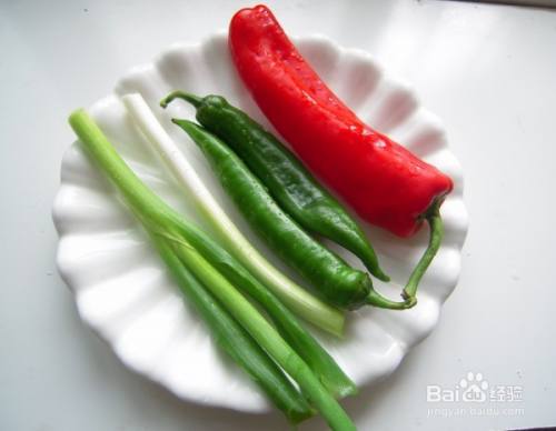大葱、青红辣椒洗净备用。