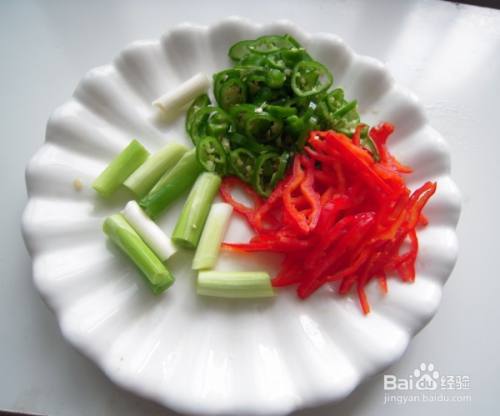 将大葱切段,小一些的葱切葱花青红辣椒分别切丝备用。