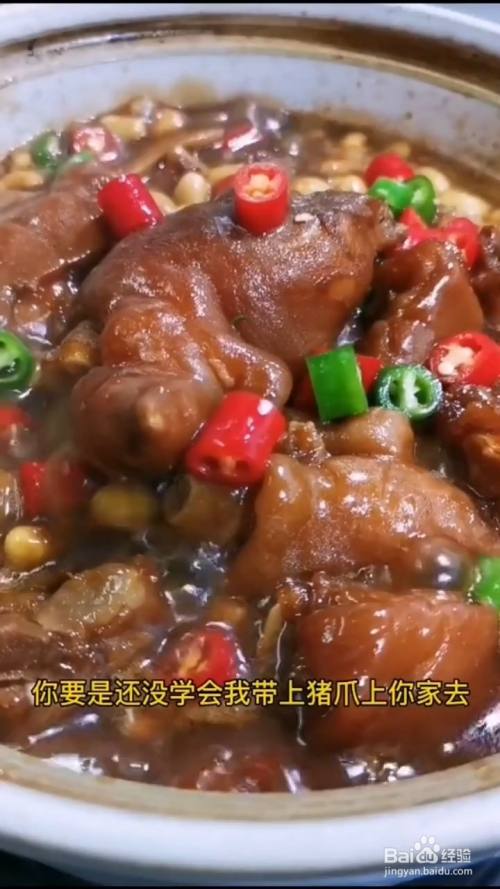 倒入提前泡好100克黄豆后盖继续炖15分钟,最后淋上10克料油大火收汁,放入10克青红辣椒即可