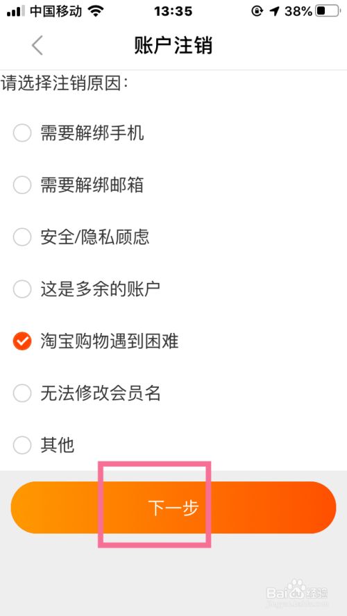 然而在账户注销的页面选择要注销的原因后点击【下一步】按钮