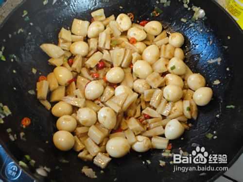 加入鹌鹑蛋炒一炒,最后淋入料汁炒匀出锅。
