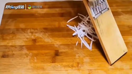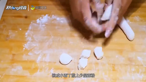 8将面团揉成长条,揪成小面丁撒上面粉。