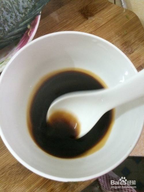 在小碗来加适量的鸡精和酱油,搅均匀,使鸡精融入酱油里。