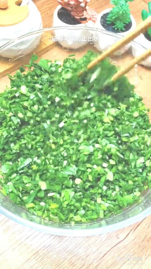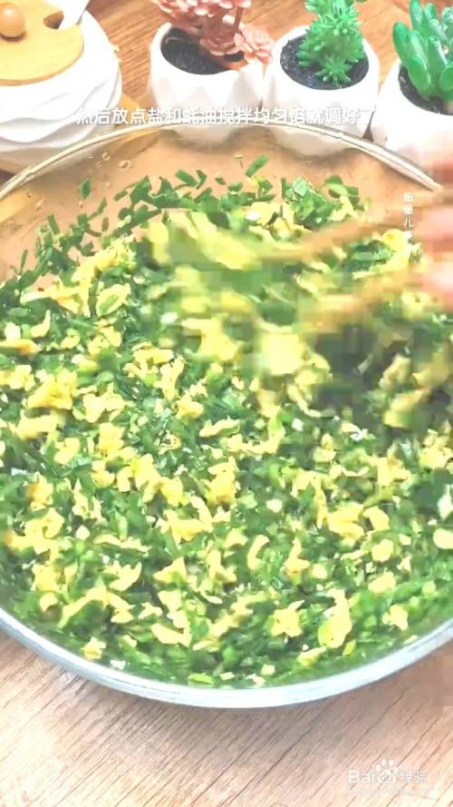 切碎的韭菜先放点食用油搅拌均匀,这样可以防止出水。鸡蛋炒熟以后需要晾凉,然后放点盐和蚝油,搅拌均匀,馅儿就调好了。