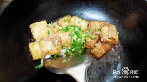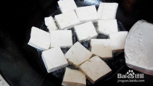 锅中放入比平时炒菜多一点的油,烧7成热,下入豆腐块。目测底面煎黄的时候再翻动煎另一面,不然的话容易碎。
