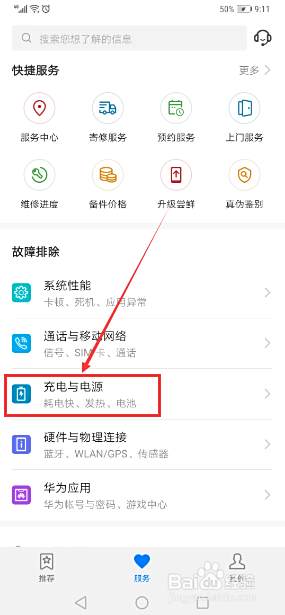 打开【服务】功能后,接着再在【故障排除】栏这里点击【充电与电源】功能。