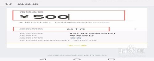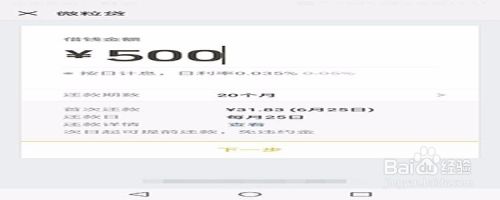 点击“借钱”之后,这时候会让你输入你要借的金额,以及还款的期限,利率也写得很明白在那里了。