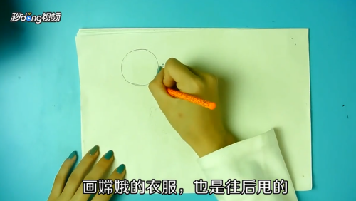 3画出嫦娥的一只手臂,另一只在袖子里不用画,在身上画一些飘逸的彩带,并把衣服的褶皱画上几条线。