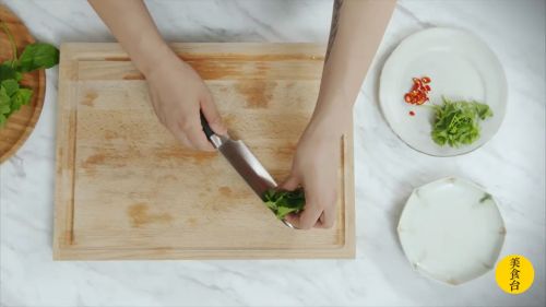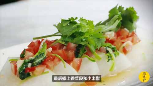 8把调好的酱汁倒在冬瓜片上,撒上香菜段和小米椒。