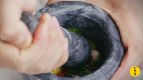 6石臼中放入薄荷、小米椒、蒜粒、白糖、鱼露,挤入青柠汁,放入泡椒捣碎。