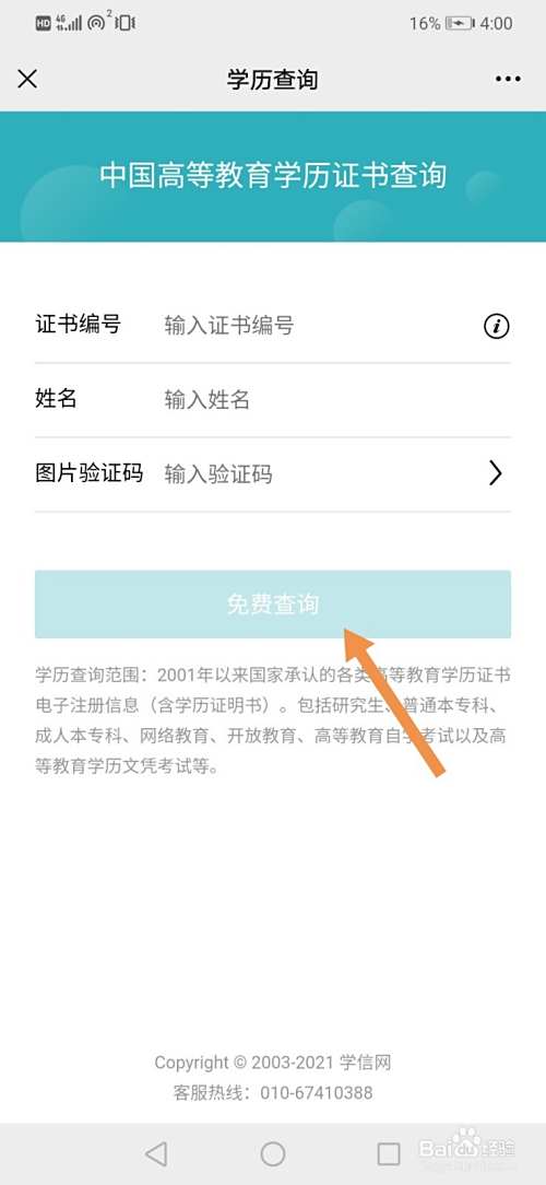 输入证书编号、姓名以及图片验证码,点击“免费查询”即可。