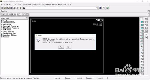双击或者右键选择打开ansys软件,该经验以ansys14.5为例作为教程。进入ansys界面后(重新建一个文件夹后)要清除数据库,开始一个新的分析。Utility Menu>File>Clear&start new,弹出对话框,选择默认状态,点击OK,再弹出对话框,选择YES.