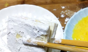 再把沾满淀粉的豆腐放入鸡蛋液中,也是周身都沾满蛋液。