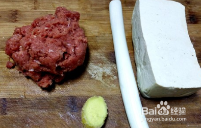 首先处理食材,猪肉用绞肉机搅成肉馅,豆腐切成一厘米厚的稍微大一点的片,葱姜剁成末。