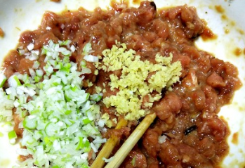 肉馅中加入油,盐,豆瓣酱,蚝油,一个鸡蛋和葱姜末搅匀备用。