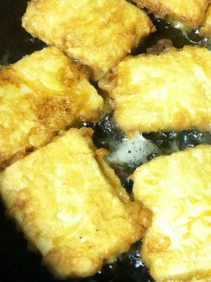 平底锅放油,油温至六成热,放入处理好的豆腐块,小火炸至两面焦黄,熟透即可装盘上桌。