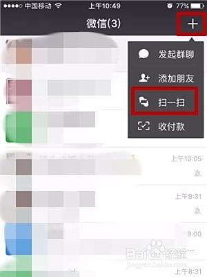 点击微信首页右上角的“+”,在下拉菜单中点击“扫一扫”,扫描我们收到的收款码。
