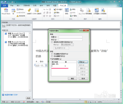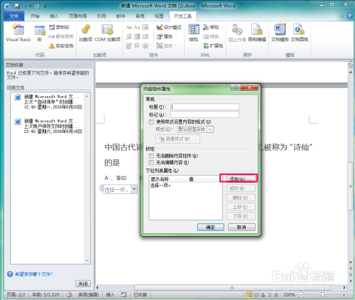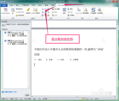 点击菜单栏上方的开放工具选项卡 点击组合框内容控件 如图