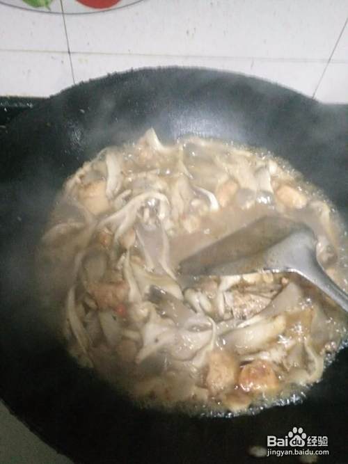 大火进行烹制,此时加入食盐,老抽等调料。蘑菇中含有大量水分,不需要加入清水。