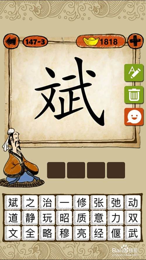 成语玩命猜第147-3关,如下图,“斌”由“文”和“武”组成,答案文武双全。