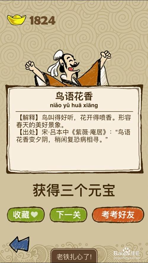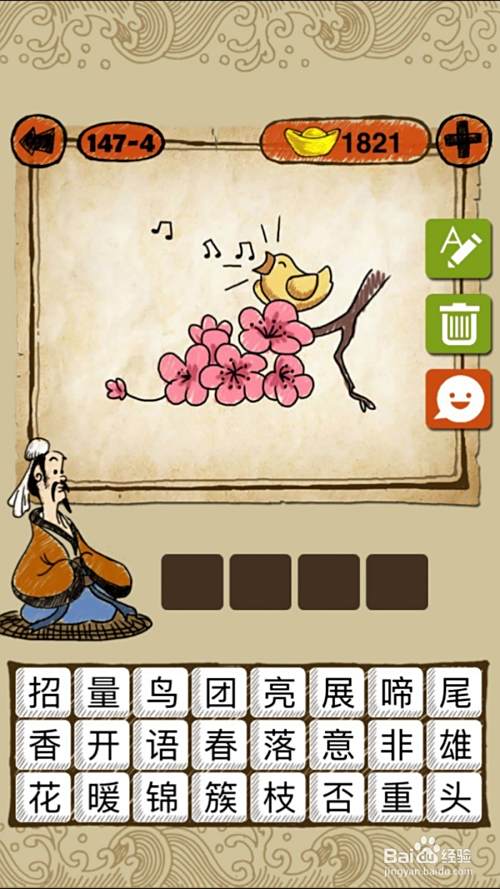 成语玩命猜第147-4关,如下图,小鸟在歌唱,花儿开的香,答案鸟语花香。