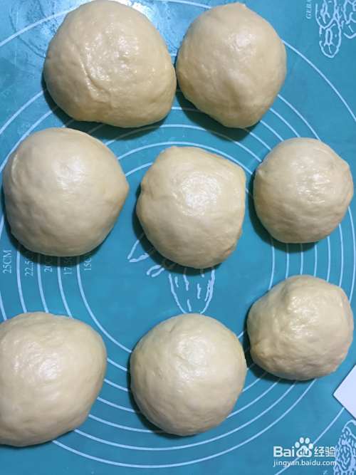 取出排气,分成相等的8份,揉圆盖保鲜膜松弛10分钟。(揉面时面团太粘,在案板上抹点油,最好不要撒面粉哦,如果撒面粉也要薄薄的撒一层,不要撒多)