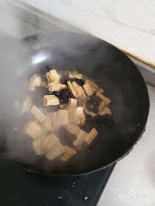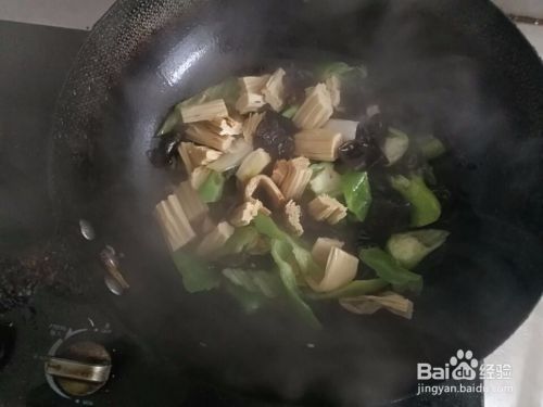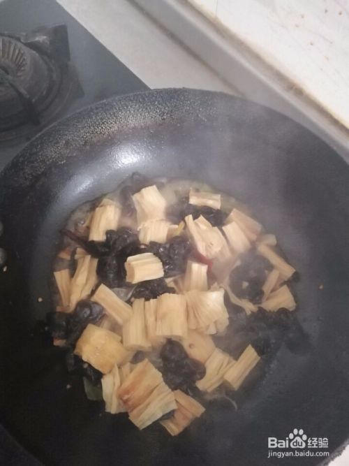 紧接着把木耳和腐竹搁锅,搅在一起连同炒料翻炒,掂起锅托向上挑几下,使之均匀。