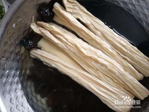 将腐竹取出,盆中盛入些许清水,腐竹放里面微泡渐软,木耳也一样,大约十分钟。