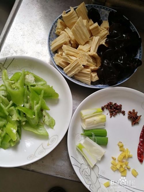 取出后,腐竹切段,非常容易切,辣椒则切成扁圆片状;将花椒、红椒啦、香葱等适材备好,如图中所摆的几种配料。