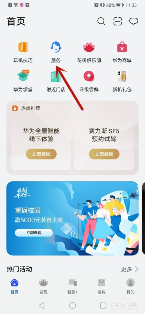 进入我的华为,点击服务。