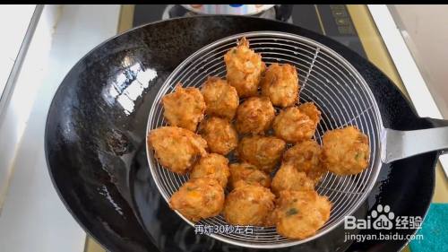 油温升到六成熟,放入炸好的丸子复炸,再炸30秒左右,炸到丸子金黄酥脆即可。