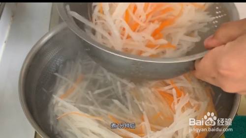 起锅烧水,水开后,放入一勺盐,放入胡萝卜,白萝卜焯水,煮2分钟后,捞出快速冲凉水。