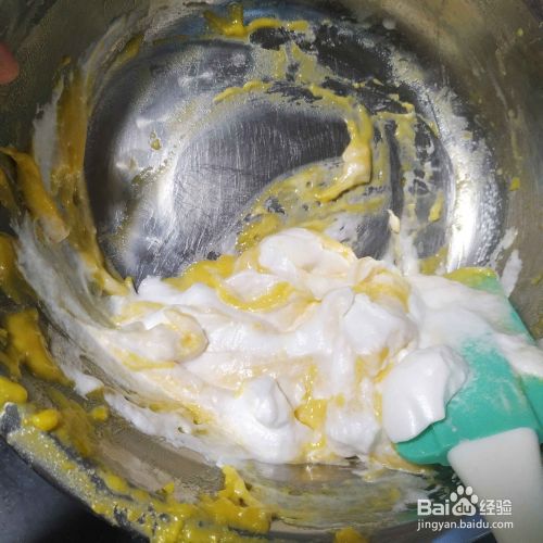 取三分之一的蛋白霜加入蛋黄糊的盆中切拌均匀。