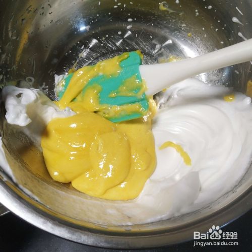将拌好的蛋黄糊倒回蛋白盆中继续翻拌均匀(小心不要让蛋白消泡)