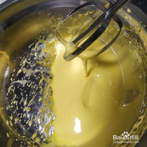 蛋黄两个放入盆里,加入5克白砂糖搅拌均匀,用打蛋器打到体积膨大颜色发白,提起蛋头蛋黄滴落有痕迹能维持一段时间再消失,加入25克橙汁搅拌均匀。