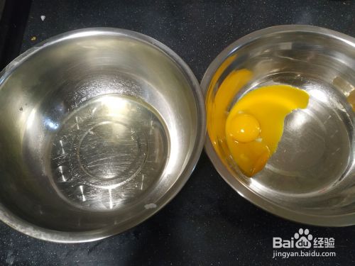 两个鸡蛋蛋清蛋黄分离,分别放进两个盆里,只留一个鸡蛋的蛋白就够,多出来的蛋白一会可以炒菜吃