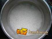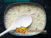 3将拌好的糯米装进饭盒子里(在盒子四周与底抹上薄薄一层猪油)。放一层糯米,压紧一层。(一定要压实)