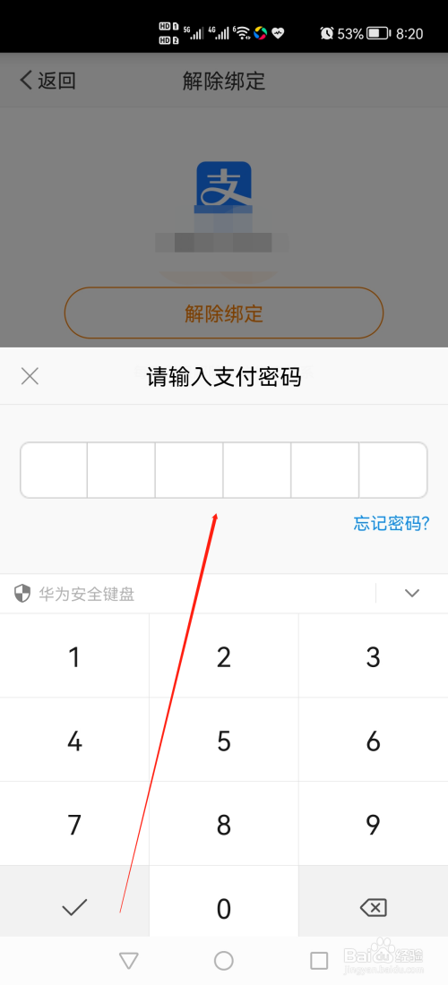 第六步、最后输入支付密码即可完成支付宝账户解除绑定,如下图所示