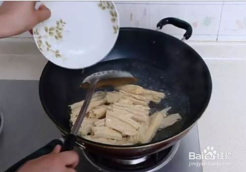 把泡发好的腐竹放入开水中焯1分钟,这样做腐竹吃起来会有弹性。